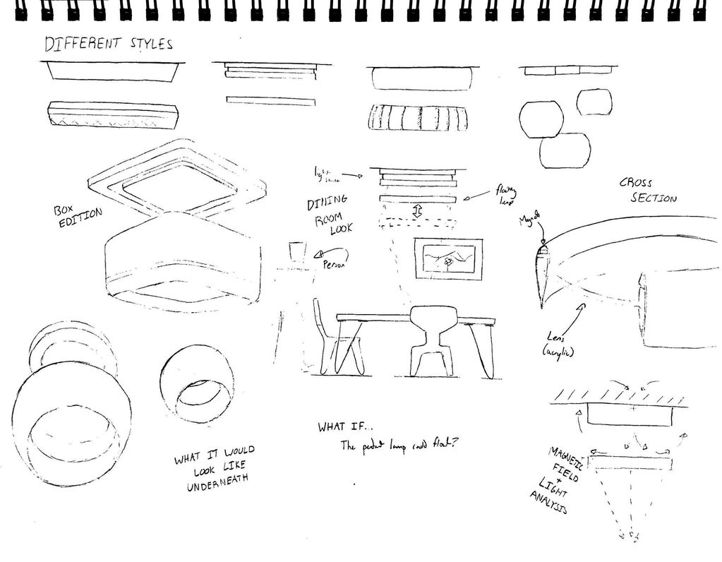 Sketch of the maglev lamp concept, along with some rough sketches of how it would, in theory, work.