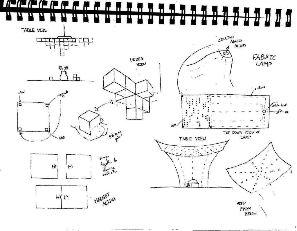 Second and third ideas. One idea was for a modular lamp that could be taken apart and each module could be brought around a room to disperse light. The other idea was for a soft lamp; something like an electriconic tapestry.