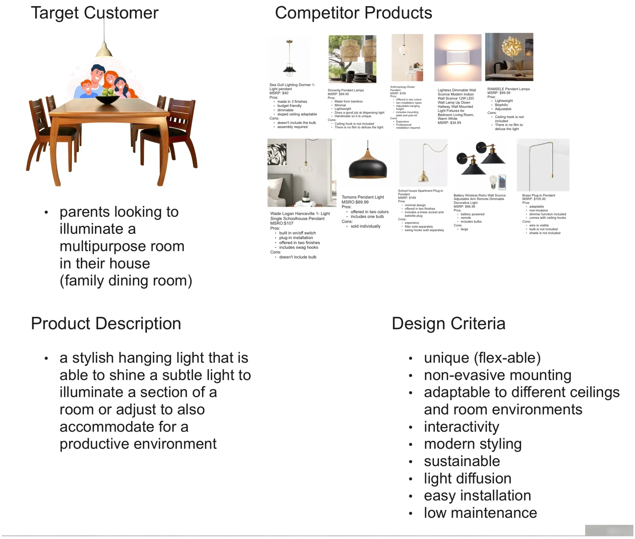 Our class, divided into teams, conducted desk market research and drew out a competitive analysis. We then wrote down what we thought were the most important criteria to any lamp fulfilling this need. This included: